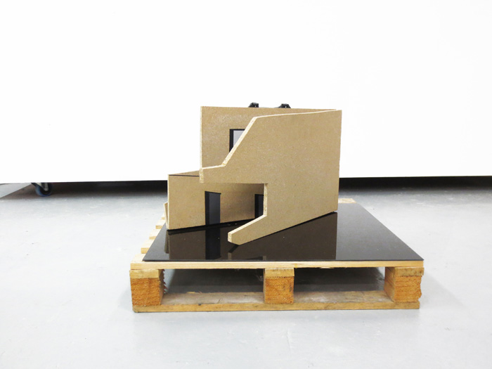 [faltbares, transportables Haus], Acryl auf Hartfaserplatte, Scharniere, Griff, Palette, schwarzer Spiegel